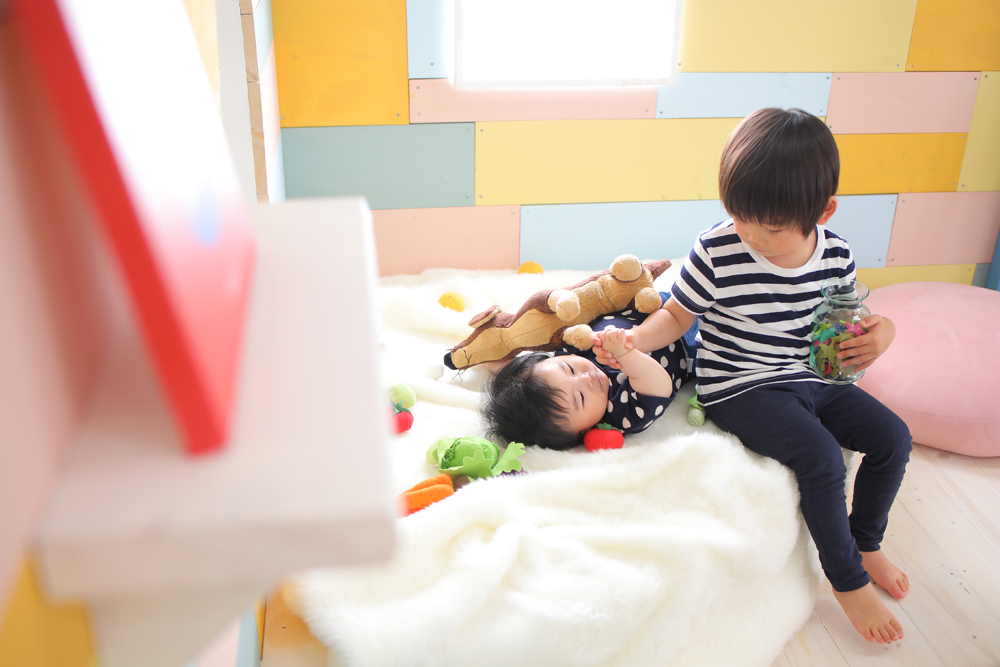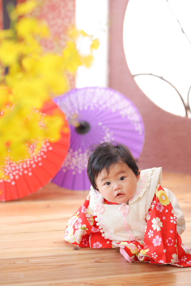 一緒に来てくれたお兄ちゃんを見てニコニコのはるちゃん^^ ご家族写真の時はお持ち込みの水玉のお洋服に着替えて とても嬉しそうな姿を見せてくれました!! 初めてのお着物もとても似合っていて可愛かったです♪