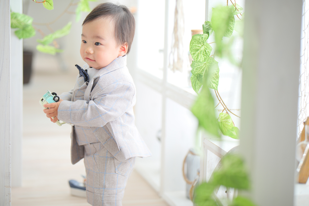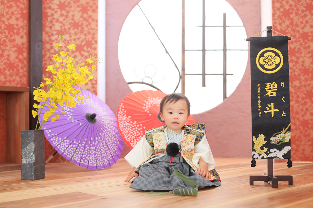 お持ち込みの陣羽織を着ての撮影でした! 最初は少し緊張していたりくとくん^^ 撮影が始まると、好きなおもちゃを見つけて 楽しそうに遊んだりスタジオの中を走り回ったりと とても元気な姿を見せくれました🌸