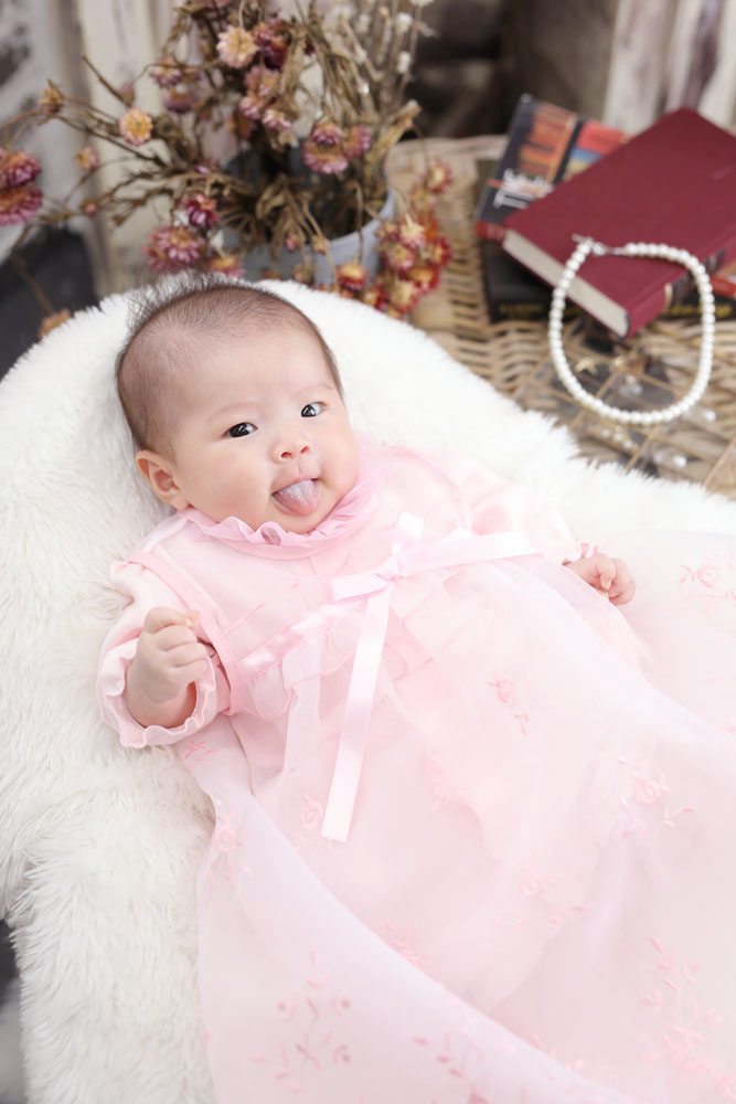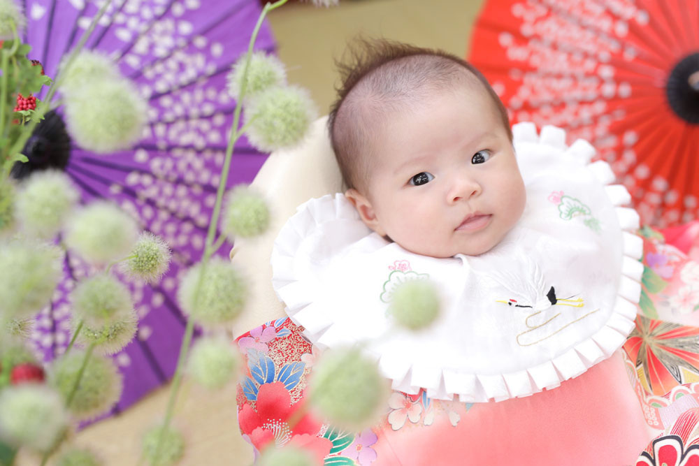 本日最初のご紹介はお宮参り記念でお越しの女の子です✿ 素敵なお着物と可愛いドレスはお持ち込みでの撮影でした!