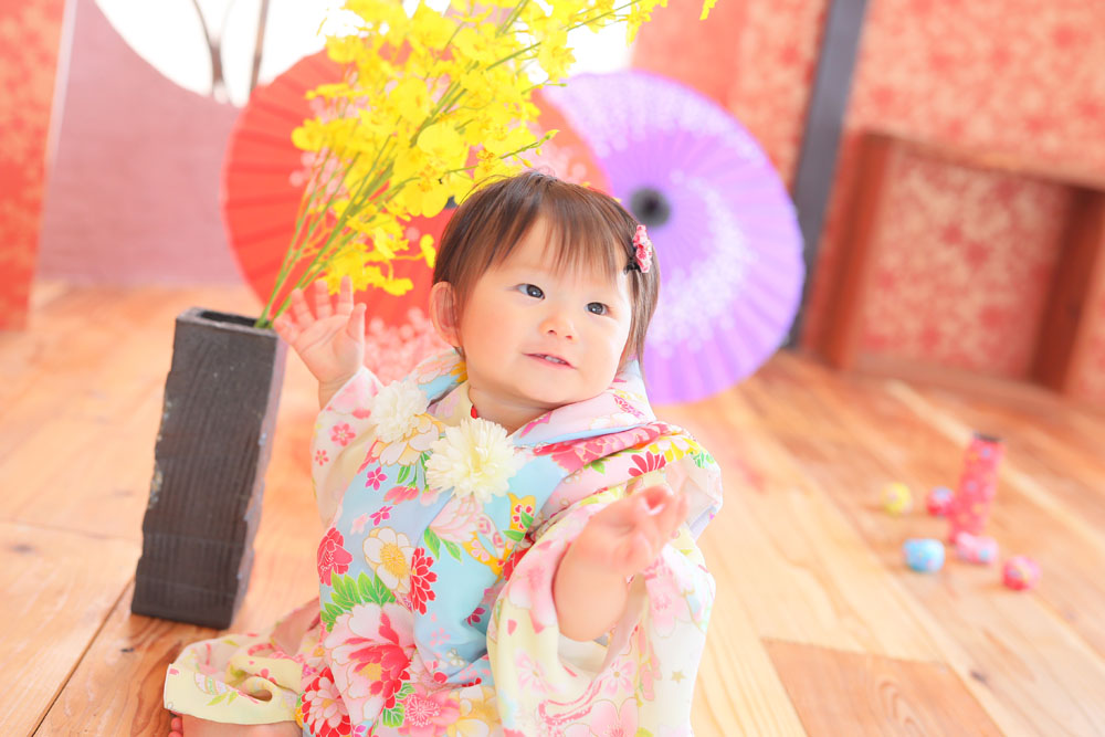 お持ち込みの素敵なお洋服とお店のお着物とでの撮影でした♪ つかまり立ちがとっても上手なひまりちゃん^^ 好きなおもちゃを見つけては指をさしておしゃべりしていました🌸 たくさん可愛らしいニコニコ笑顔を見せてくれました!!