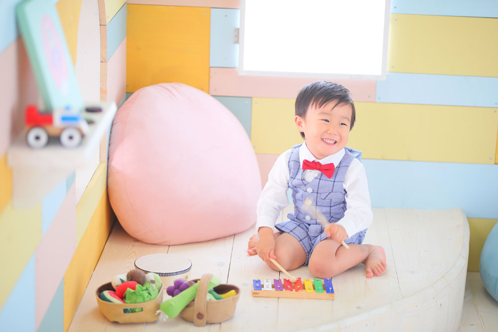 お母さんと相談して選んだお着物を着ての撮影でした♪ とっても元気いっぱいなえいじくん^^ 好きなおもちゃを見つけて遊びながら 慣れないお着物で最後まで頑張ってくれました!