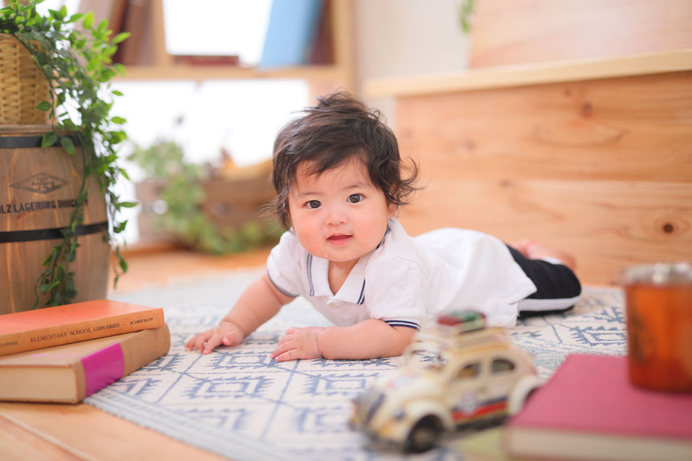 お持ち込みのお洋服とお店の衣装での撮影でした♪ とってもご機嫌さんのれんくん^^ ママさんとパパさんがお名前を呼ぶと たくさん笑顔を見せてくれました!! うつ伏せがとっても上手なれんくんでした^^