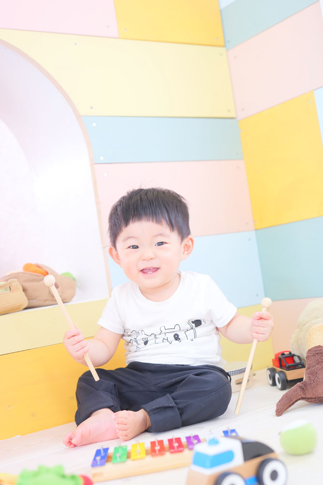 お持ち込みのお洋服とお店の衣装とでの撮影でした♪ とってもご機嫌さんのそらくん^^ 音のなるおもちゃが大好きで 木琴で楽しそうに遊ぶ姿を見せてくれました!! ハイハイもとっても早くてスタジオ内を歩き回っていました^^ 最後の方は少し眠くなっちゃったけれど 最後までニコニコ笑顔でした🌸