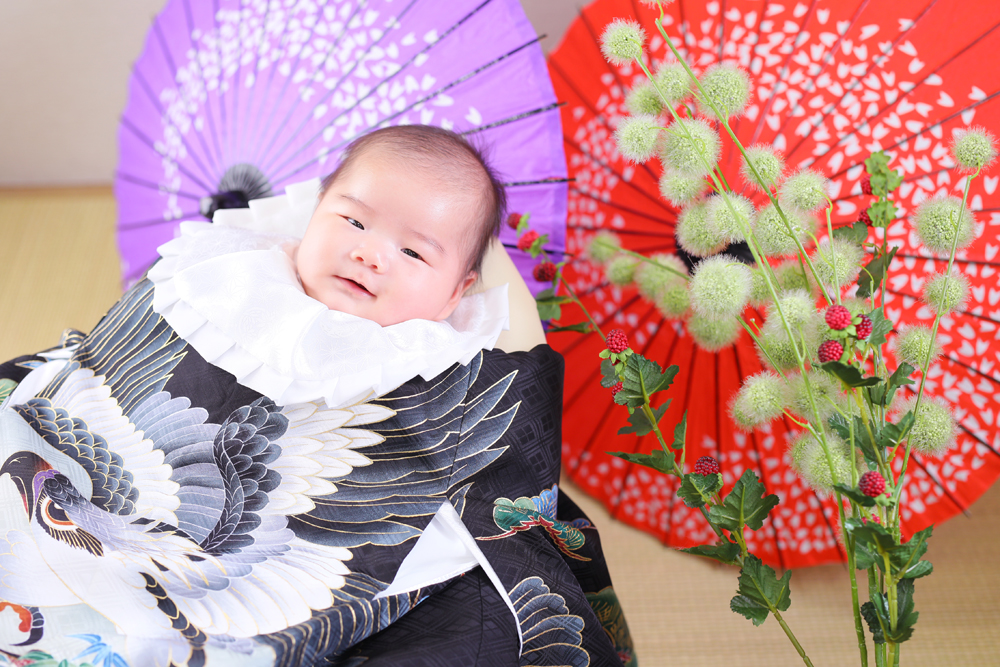 本日のご紹介はお宮参り記念でお越しのみなとくんです☆ お持ち込みのお着物とお店の衣装での撮影でした!