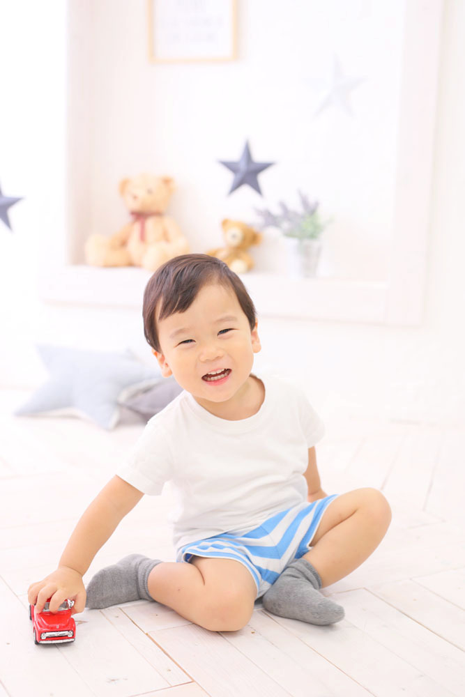 最初はとてもドキドキしていたモデルさん^^ スタジオにある車のおもちゃで遊んでいるうちにニコニコ笑顔に! 車が走るだけで笑顔になってくれて素敵な撮影になりました☆☆