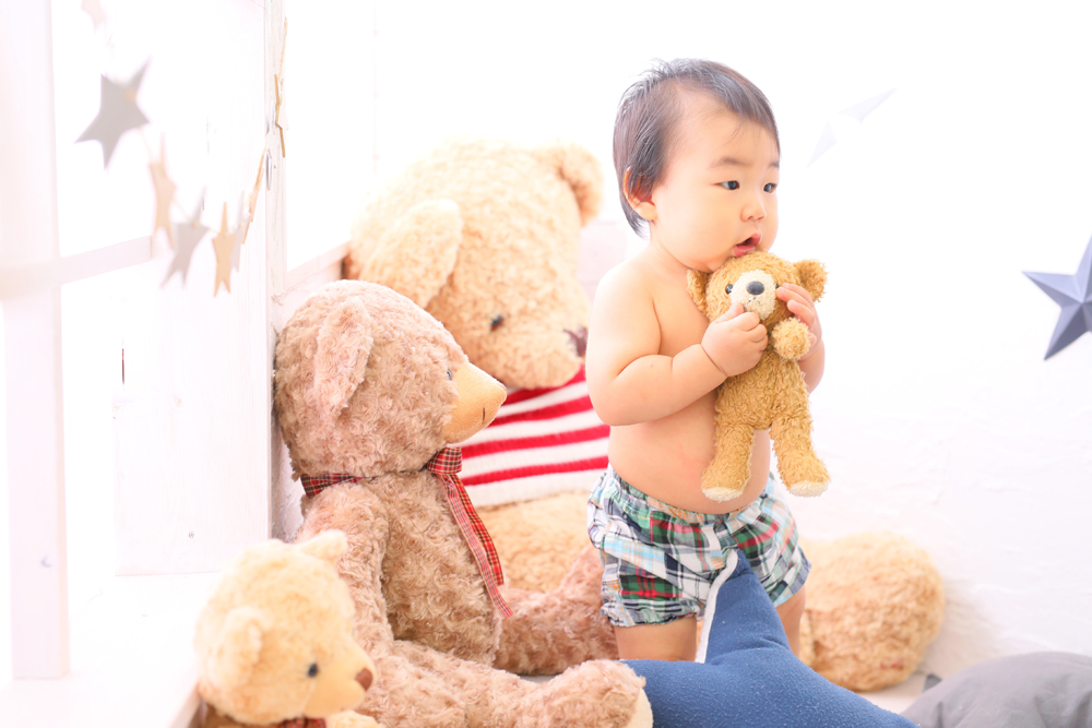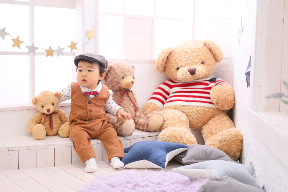 初めはじーっとカメラを見て様子をうかがっていたみなとくん^^ 慣れてくれとたくさん歩いたりスタジオのクマさんを抱きしめたり! 最後までパワフルにモデルさん頑張ってくれました!!