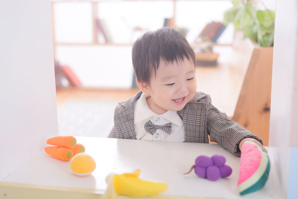 お持ち込みのお洋服とお店の衣装での撮影でした♪ 最初は少し場所見知りをしていて不安そうだったなぎくん🌸 でもすぐに慣れてスタジオにあるおもちゃに夢中でした^^ 色んな表情をたくさん見せてくれたなぎくんでした!!