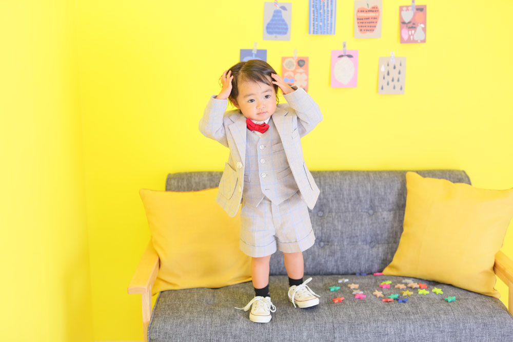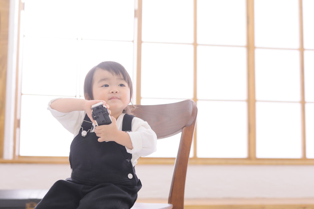最初は緊張していたあさちゃん^^ おもちゃで楽しそうに遊びながら撮影頑張りました! ママが選んでくれたボーイッシュな衣装もバッチリでした♪