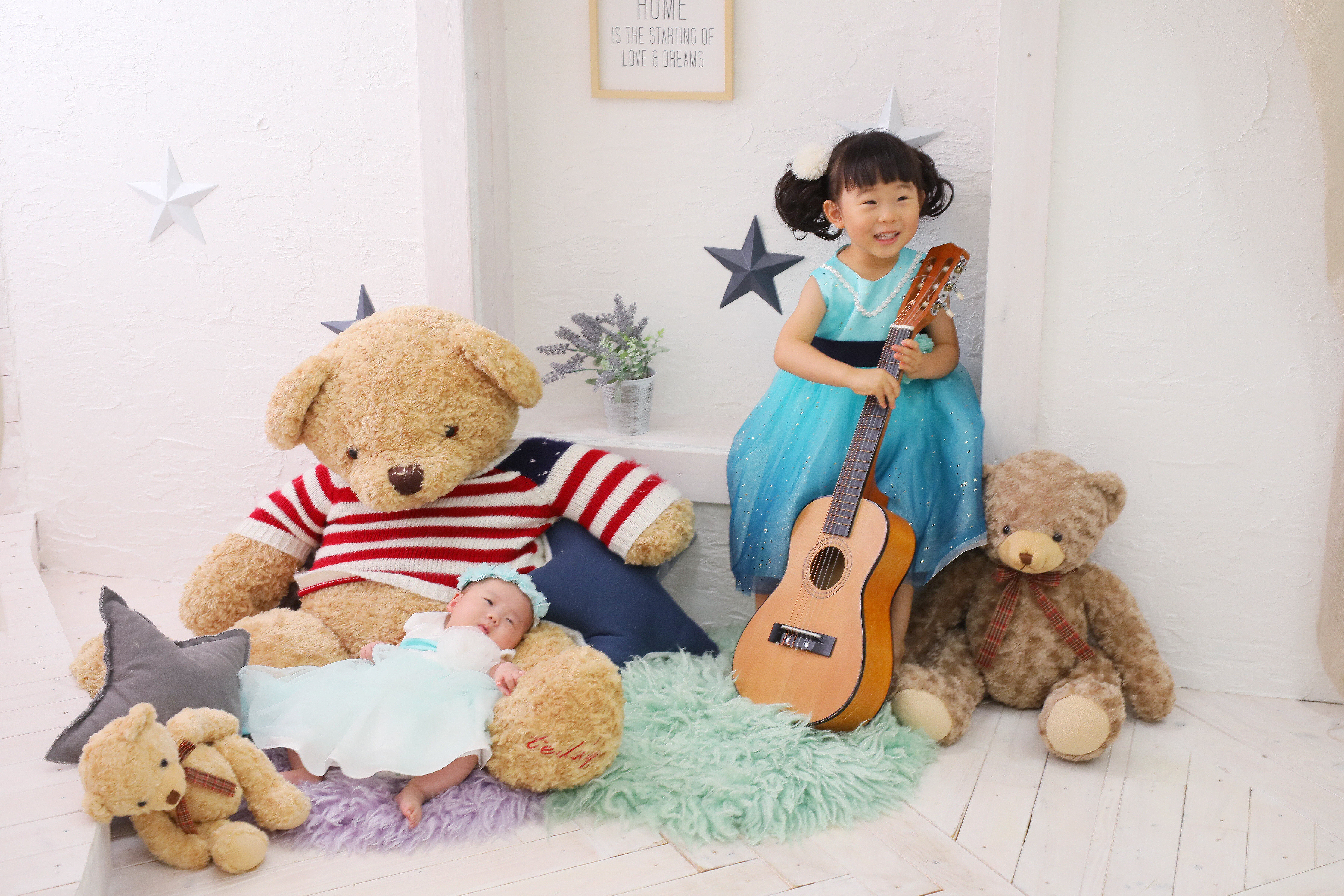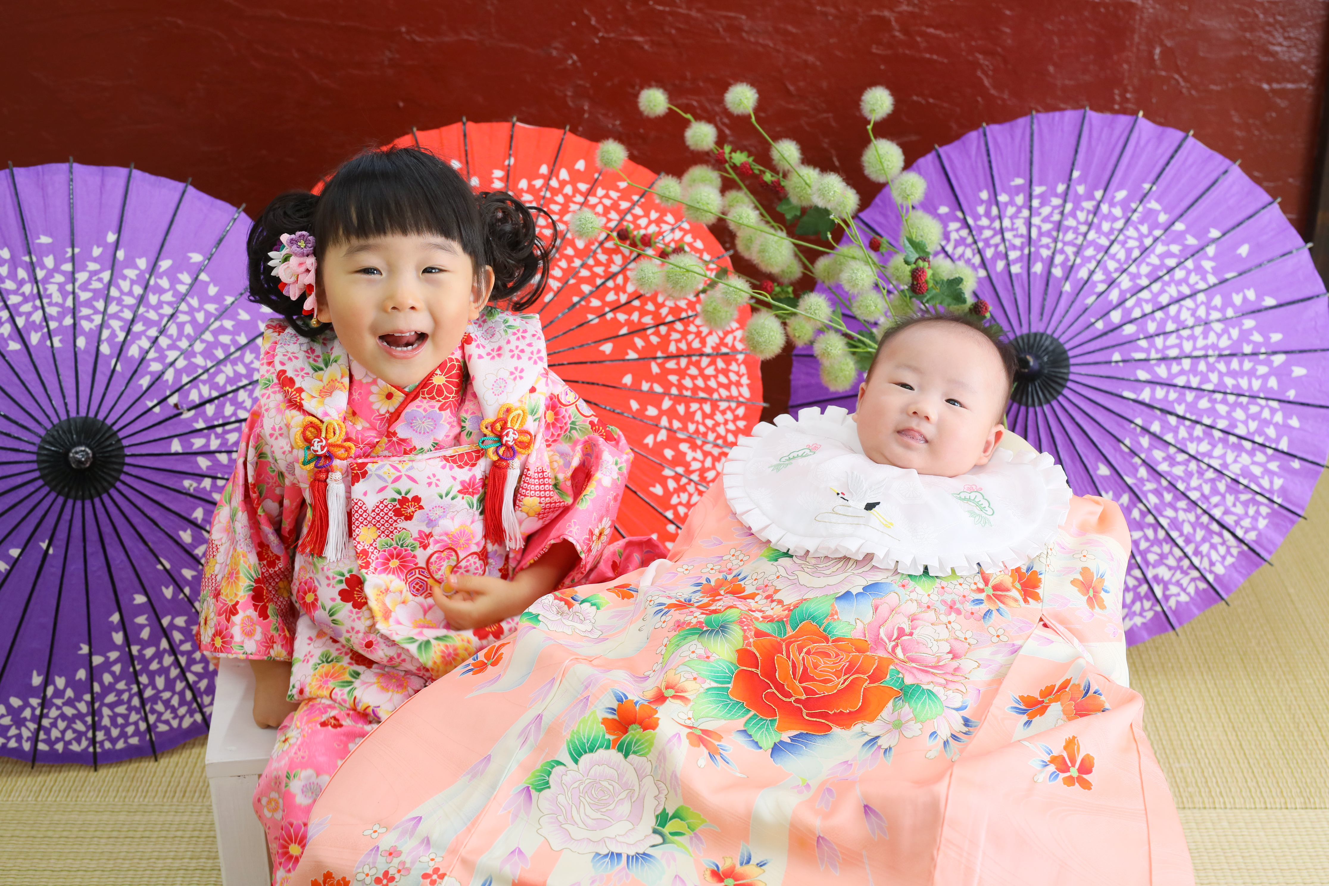 本日最初のご紹介は3歳七五三記念のゆのちゃんとお宮参り記念のさわちゃんです✿ お持ち込みとお店のお衣装での撮影でした!