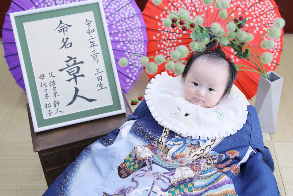 本日最初のご紹介はお宮参り記念でお越しのあきひとくんです☆ お持込みとお店のお衣装での撮影でした! とっても素敵な兜飾りも持ってきていただきました!