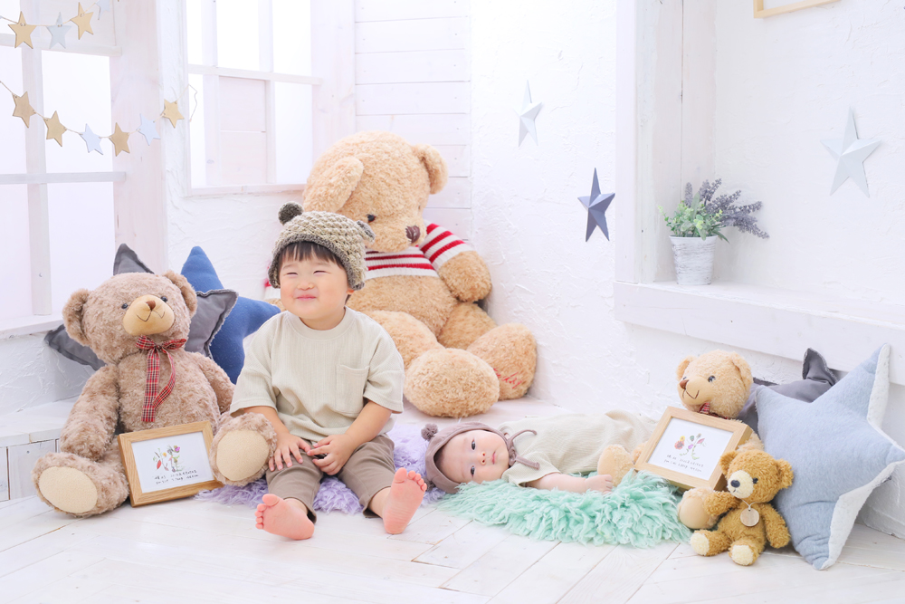 本日のご紹介は百日記念でお越しの男の子です🌟 お兄ちゃんと一緒に来てくれました! お持ち込みいただいたお衣装とお店のお衣装での撮影でした!