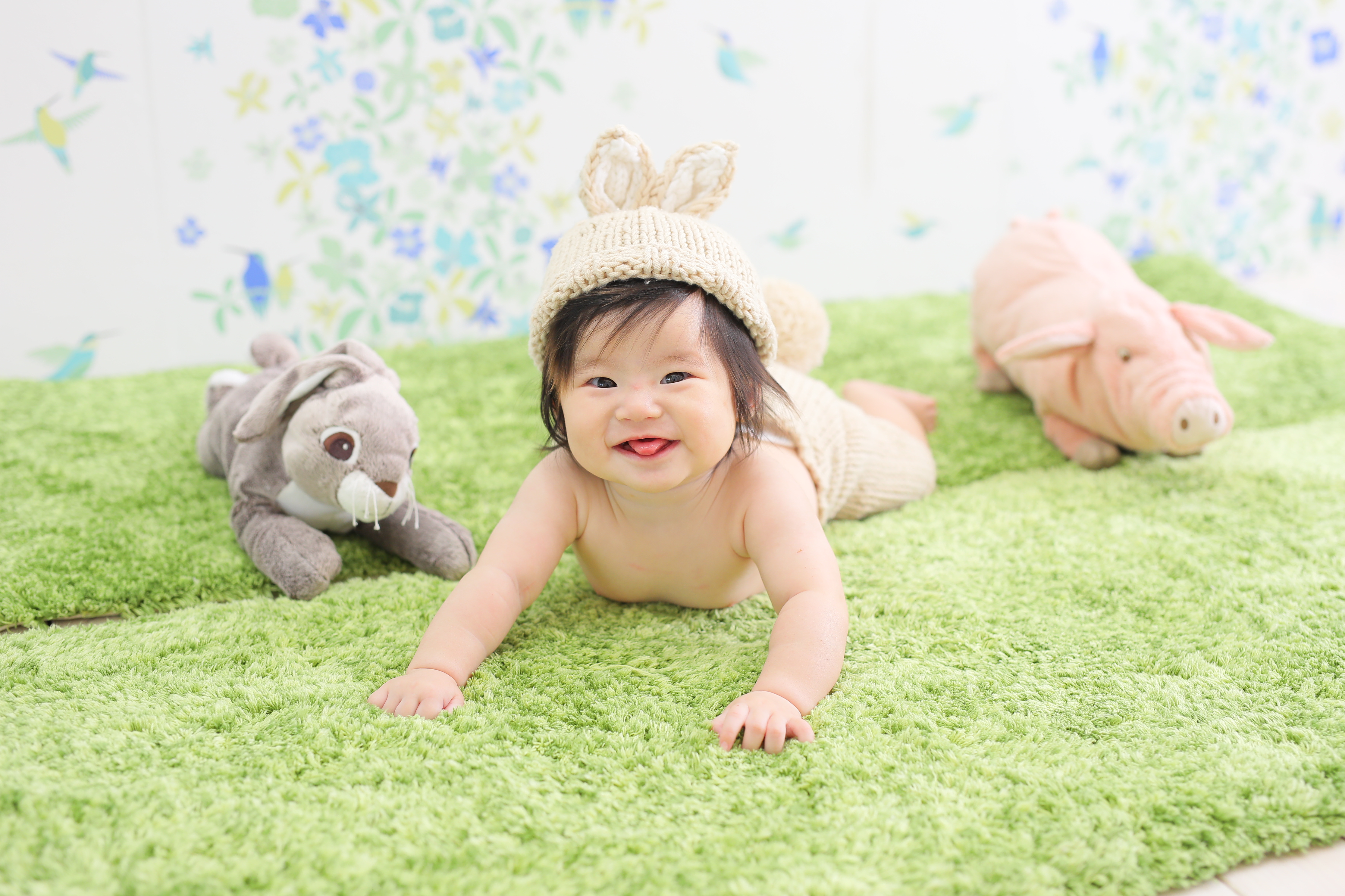 うつ伏せが上手なおうかちゃん^^ ゴロンと仰向けにしてもすぐにうつ伏せになっていました! 音のなるものがだいすきなようでした☆☆ 最後までモデルさんありがとう!!