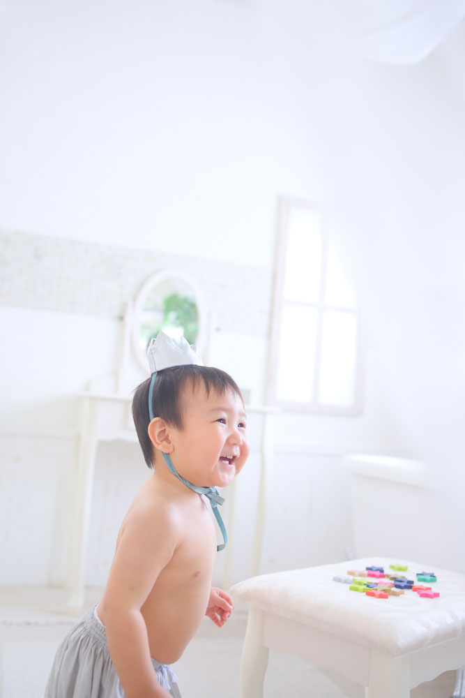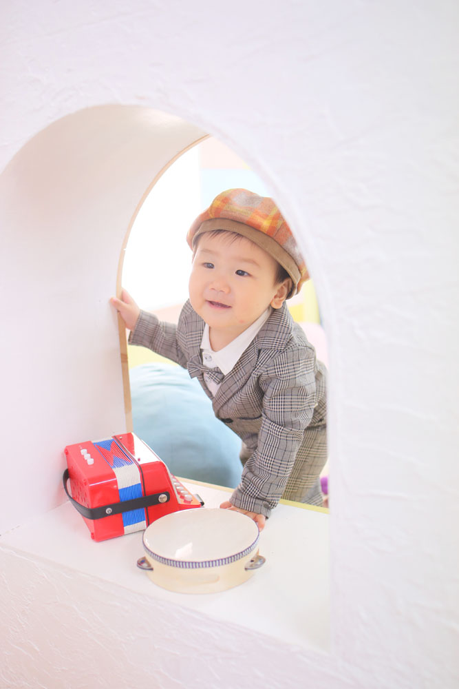 お店に着いたときは抱っこから降りられなかったしじゅうくん^^ 撮影が始まるまでに慣れてくれたようで カメラ目線でニッコリ♪