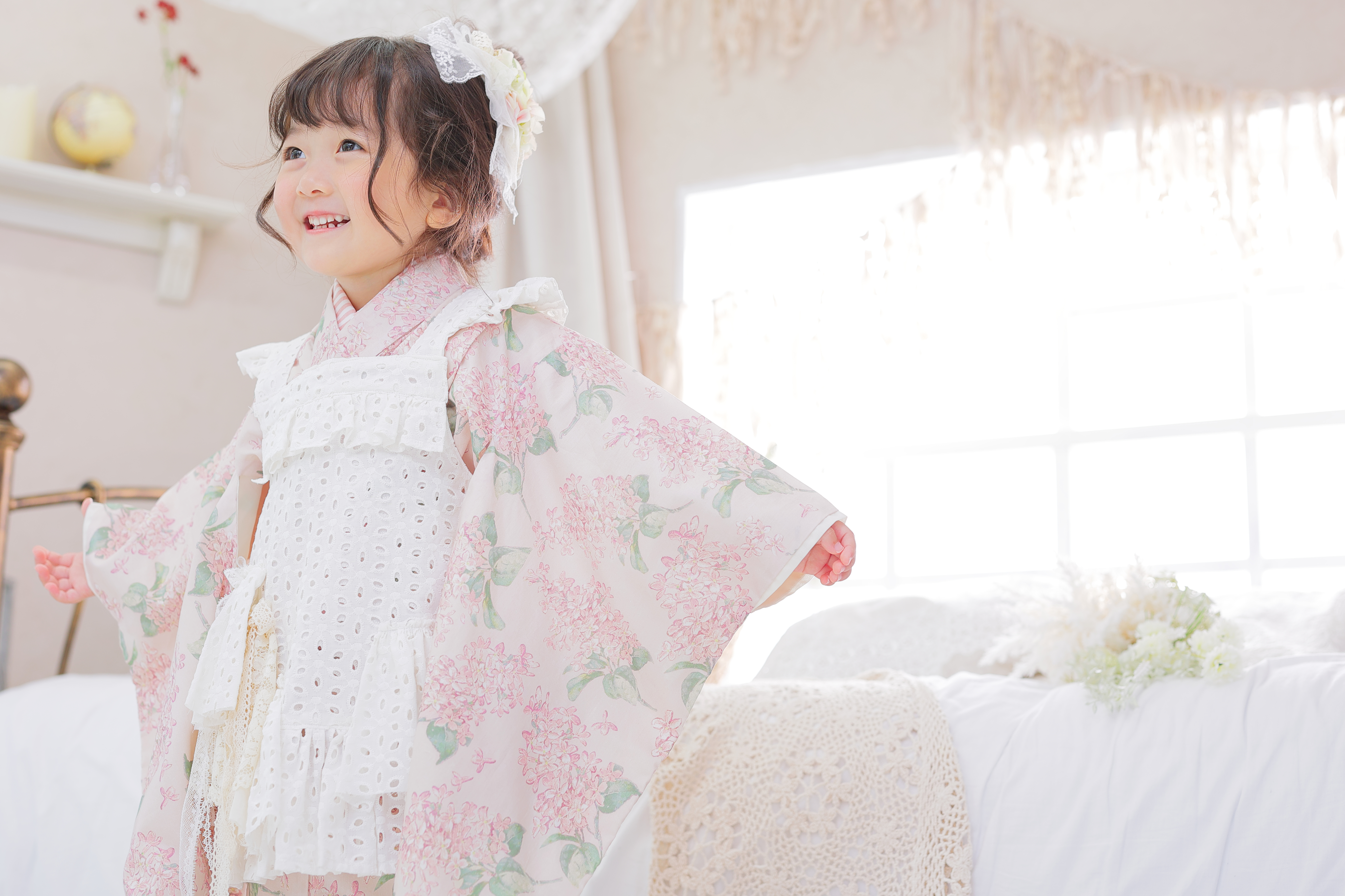小物合わせには淡い色味のお花の髪飾りをセレクト❀