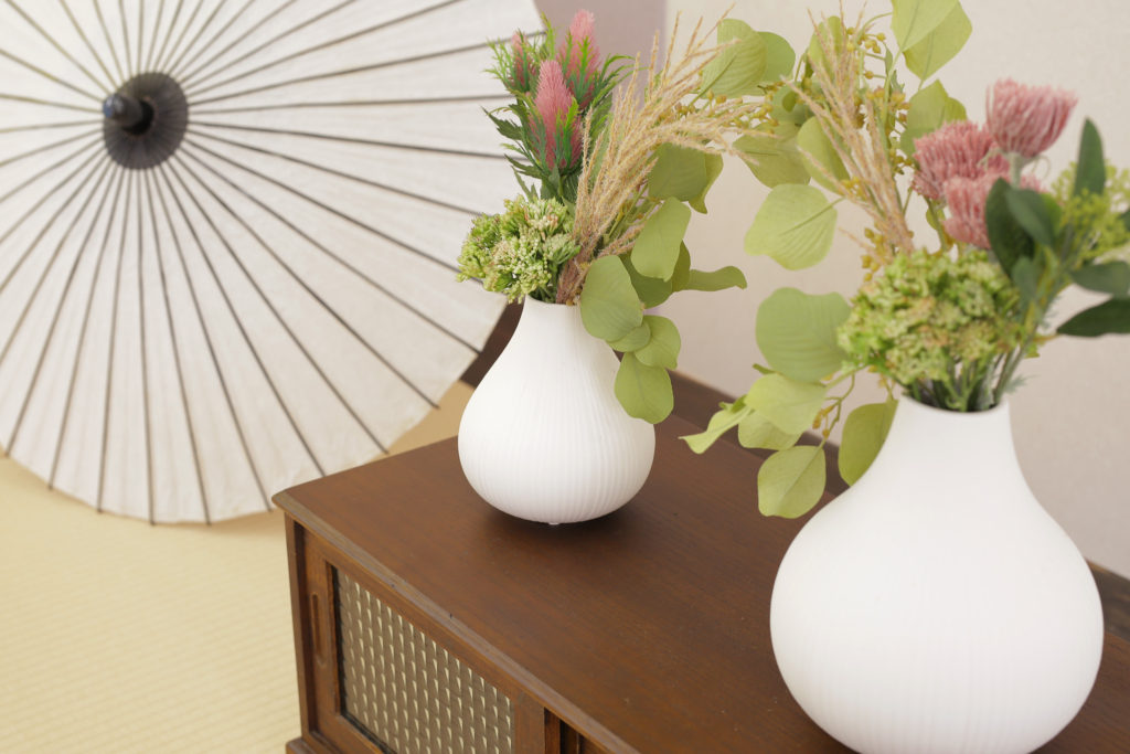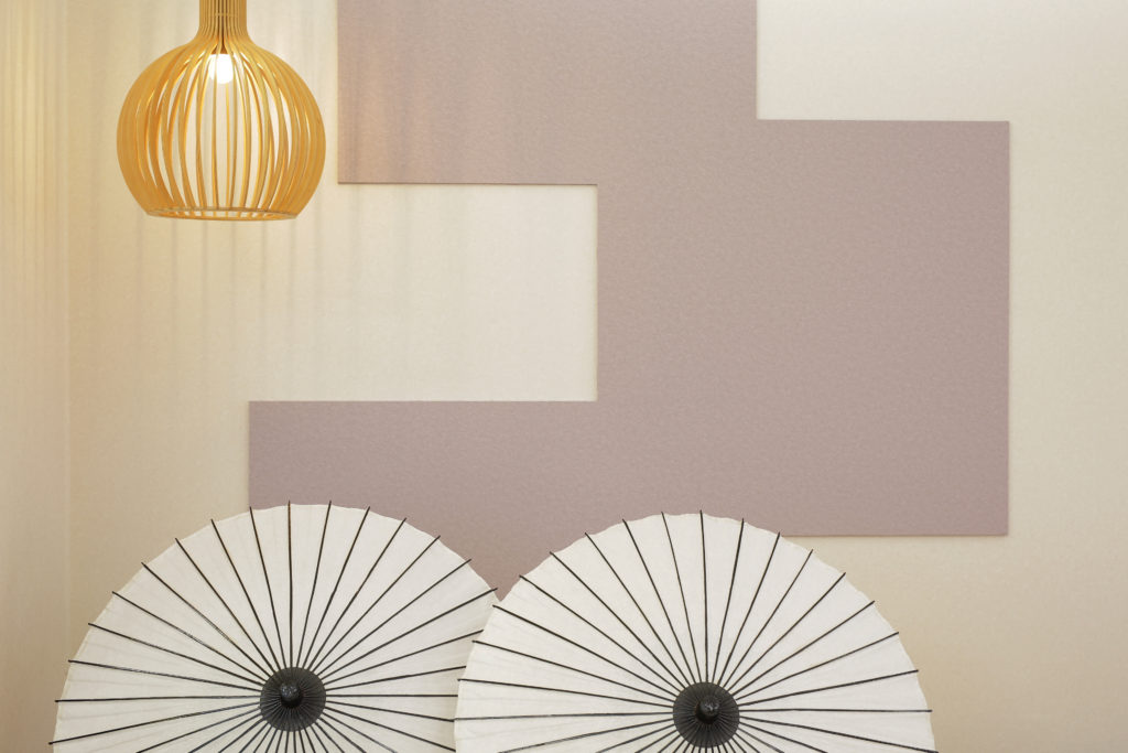 くすみピンクの壁飾りがアート感漂う和室。