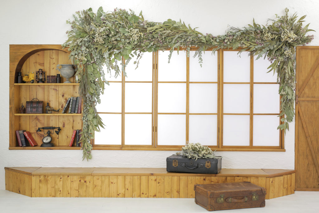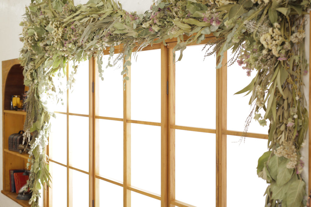 窓の周りにたくさんのドライフラワーを装飾し