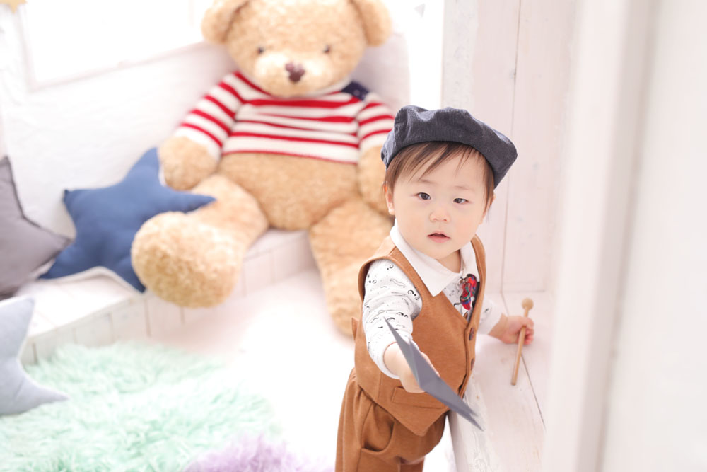 スタジオのおもちゃに興味深々で夢中になりつつ撮影!