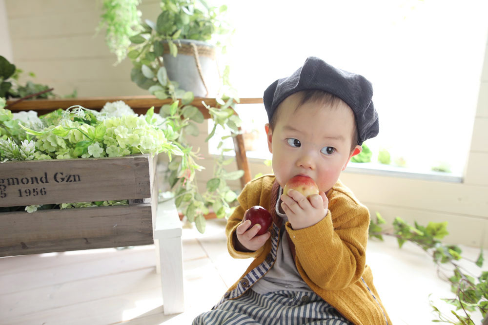 ご機嫌さんで撮影スタートしたそうたくん✿ たくさんお話してくれたりと素敵な笑顔を見せてくれました! 後半ではお腹が空いたのかスタジオにある果物のおもちゃをモグモグ^^ 最後まで頑張ってくれました!!