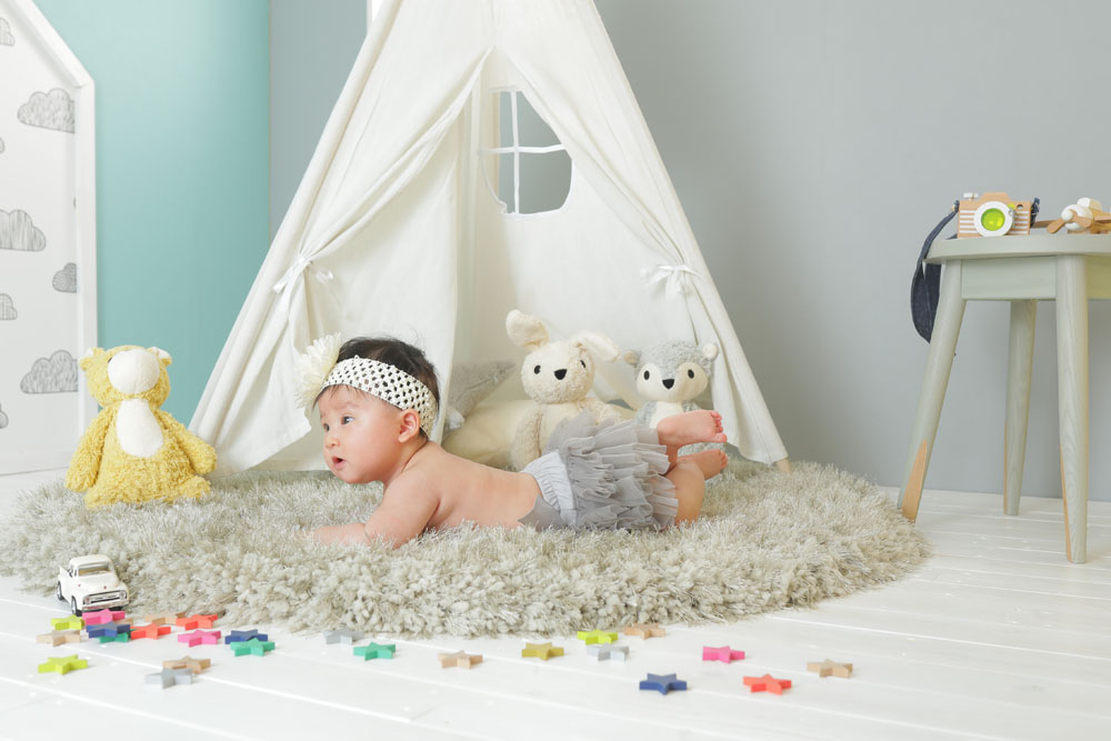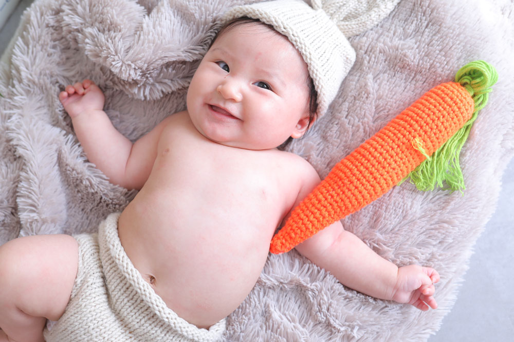 お店に着く直前までお昼寝をしていたひなのちゃん^^ 撮影が始まる頃には目も覚めてニコニコ笑顔を見せてくれました! うつ伏せもとっても上手でした! ママさん、パパさんご協力ありがとうございました!!
