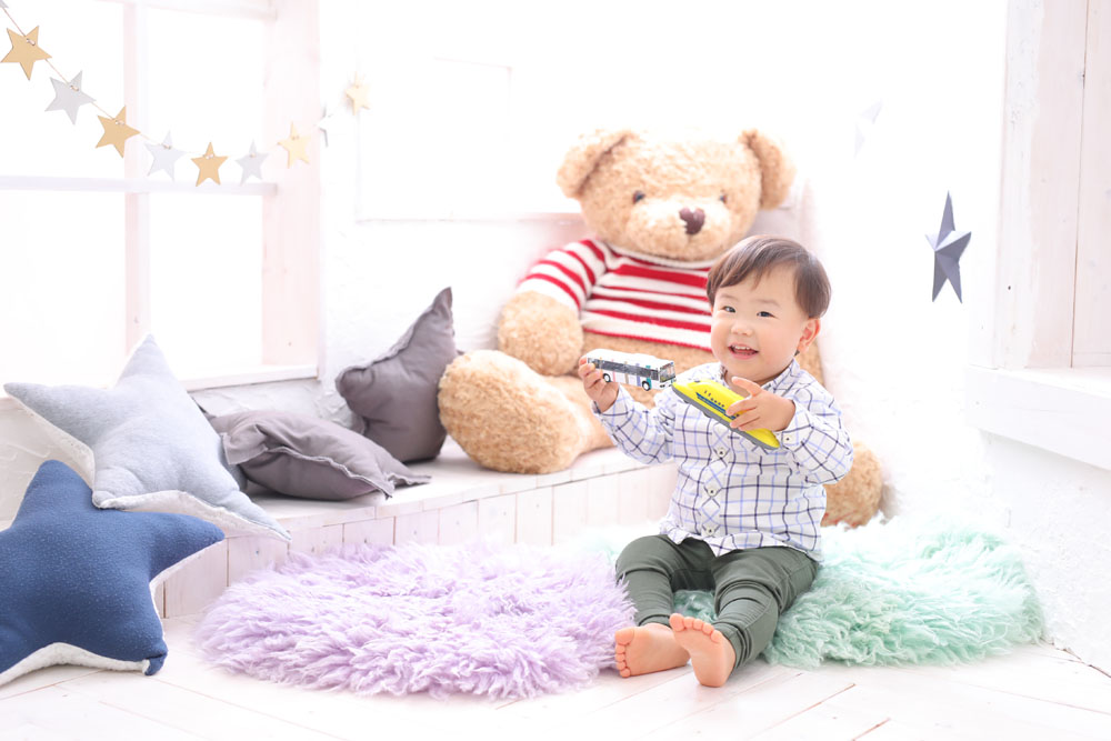 こんにちは!スタジオマルシェのひらです♪ 本日、最後のご紹介は2歳誕生記念の男の子です☆☆ お家から持ってきてくれた大好きなバスと電車で ニコニコ…