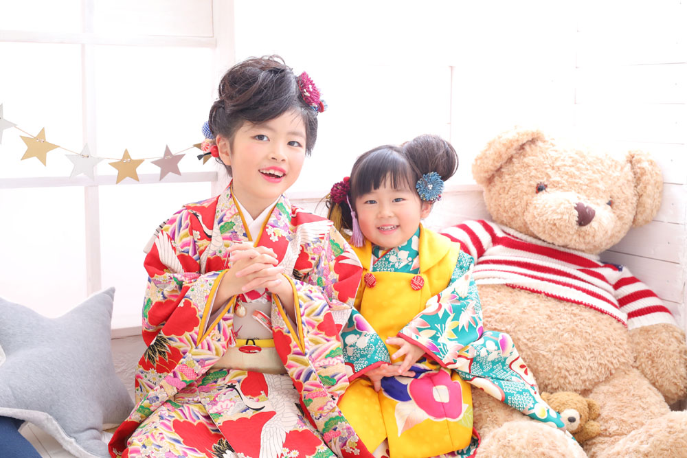 こんにちは!スタジオマルシェのひらです♪ 続いてのご紹介は3歳七五三記念のりみちゃんと 7歳七五三記念のあみちゃんです☆☆ 2人共可愛くヘアセット…