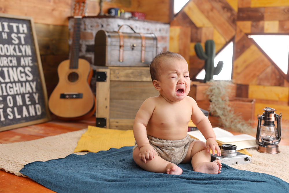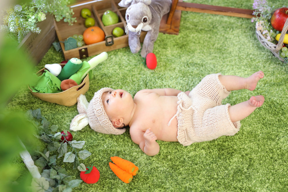 こんにちは!スタジオマルシェのひらです♪ 本日最初のご紹介は 百日記念でお越しの男の子です☆ 直前まで寝ていて撮影がスタートすると たくさん寝返…