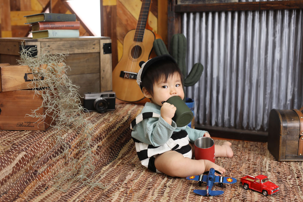 こんにちは!箱崎A店のけいです♪ 本日、最後のご紹介は1歳誕生記念の男の子です☆ お店に着く直前まで寝ていたそうですが 撮影中は最初から最後までニ…