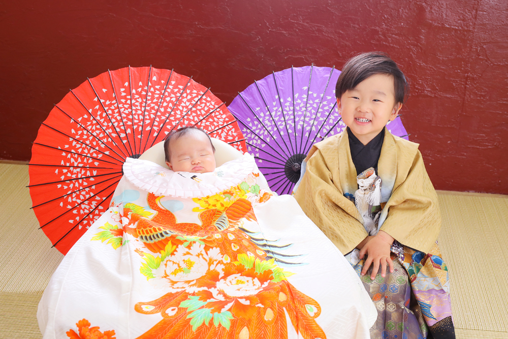こんにちは!大濠店のひらです♪ 本日最後のご紹介はお宮参り記念と3歳七五三記念でお越しのめいちゃんとひろとくんです✿ 素敵なお着物を持ってきてくれました…
