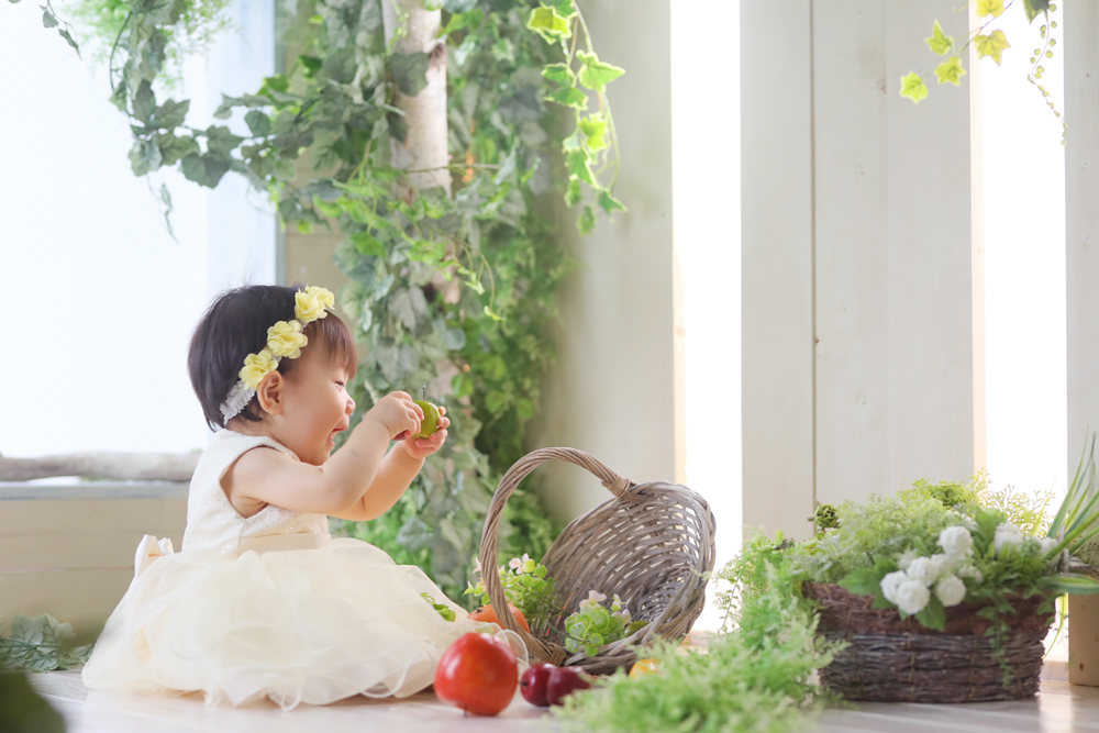こんにちは!大濠店のひらです♪ 本日のご紹介は1歳誕生記念でお越しの女の子です✿ 元気いっぱいでご機嫌だったモデルさん^^ スタジオにあるリンゴや…