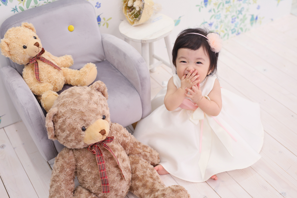 こんにちは!大濠店のひらです♪ 本日最初のご紹介は1歳誕生記念でお越しの女の子です✿ お持ち込みとお店のお衣装での撮影でした! とってもご機嫌で笑…