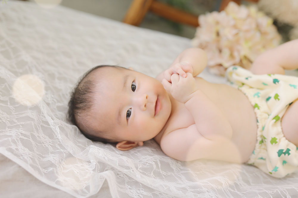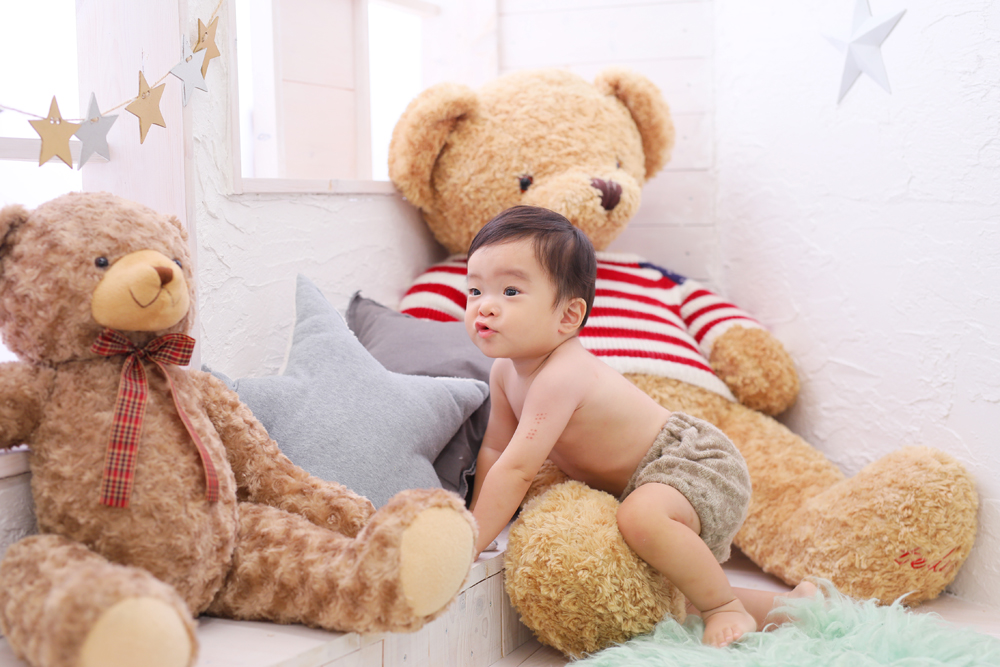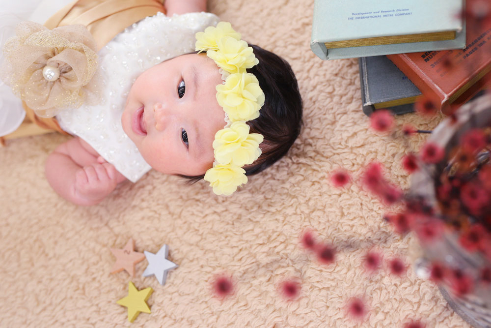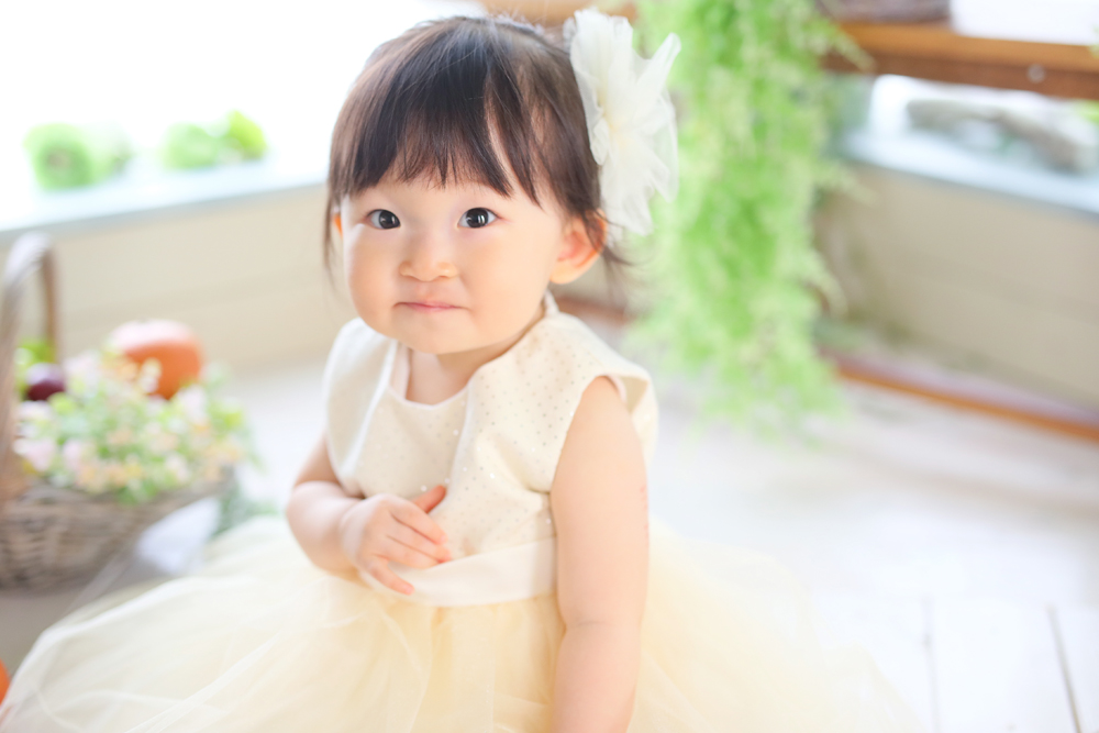 こんにちは!大濠店のひらです♪ 本日最初のご紹介は1歳誕生記念でお越しの女の子です✿ 寝起きでお店に到着したモデルさん^^ 撮影中もとても眠たそう…