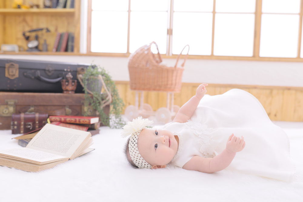 こんにちは!箱崎A店のけいです♪ 本日、最後のご紹介はお宮参り記念の女の子です☆ お店に着いた時は気持ち良さそうに寝ていたモデルさん^^ お着替え…