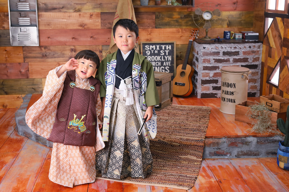 こんにちは!大濠店のひらです♪ 本日最後のご紹介は3歳七五三記念と5歳七五三記念でお越しの男の子たちです☆ お着替えが少し苦手な弟くんとお手本になっ…