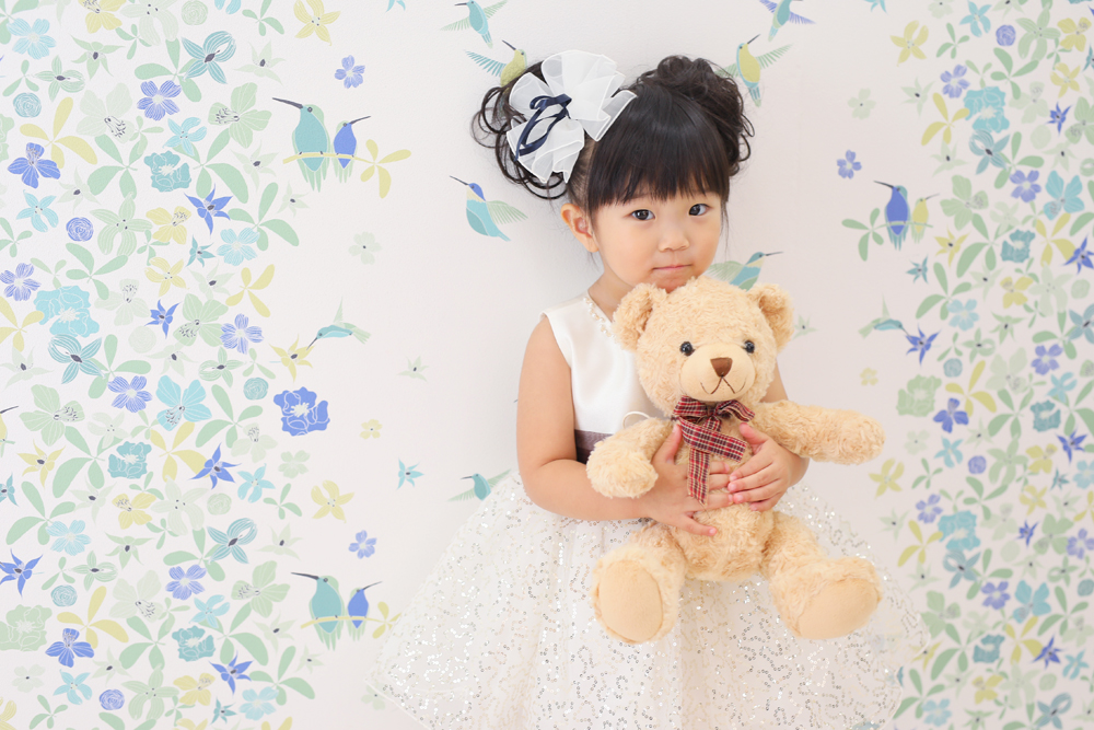 こんにちは!大濠店のひらです♪ 本日最初のご紹介は3歳七五三記念でお越しの女の子です✿ 少し緊張していたモデルさん^^ スタジオに入るとクマさんを…