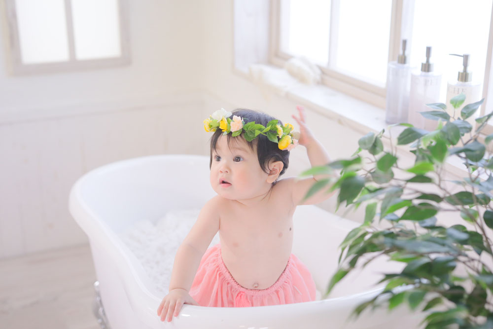 こんにちは!大濠店のひらです♪ 本日最後のご紹介は1歳誕生記念のひなたちゃんです🌸 お店に着くまで寝ていたひなたちゃん^^ 撮影が始まるとニコニコ…