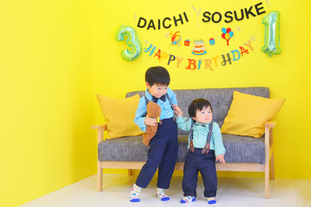 こんにちは!箱崎A店のあーです♪ 本日、最後のご紹介は3歳バースデー記念のだいちくんと 1歳バースデー記念のそうすけくんです☆彡 2人お揃いのお洋…