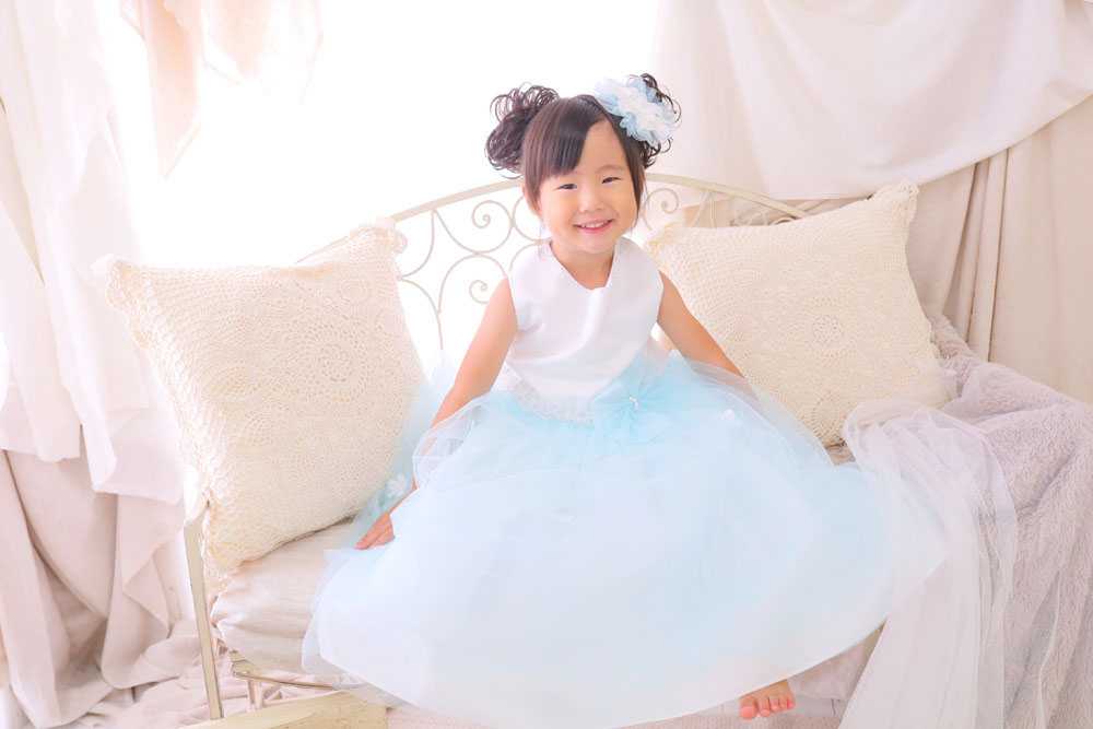 こんにちは! 七隈店のゆんです! 本日のご紹介は、3歳の七五三記念でお越しのいちかちゃんです🌸 いちかちゃんが選んだ青のド…